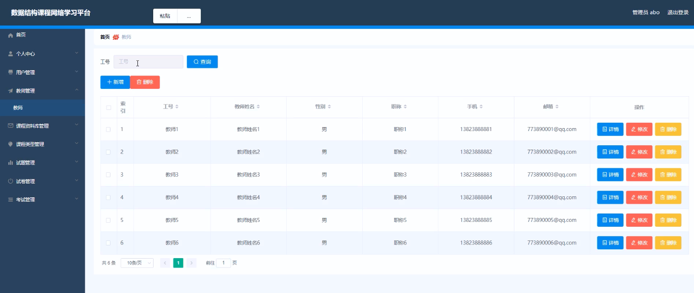 数据结构课程网络学习平台的系统管理员可以管理教师信息,可以对教师信息添加修改删除操作。具体界面的展示如图5.1所示。