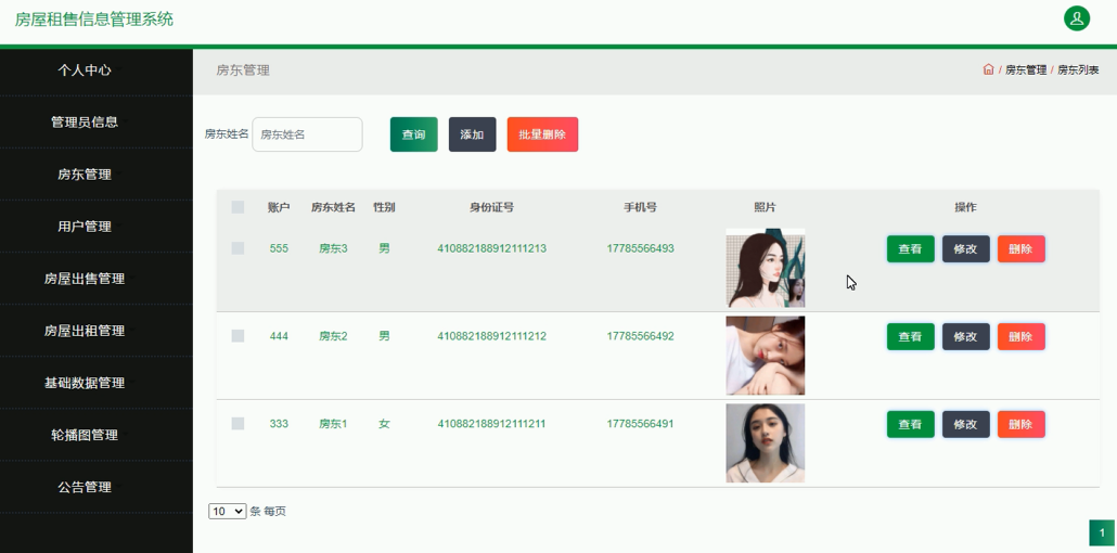 管理员可以通过选择房东管理,管理相关的房东信息记录,比如进行添加房东信息,查看房东姓名,修改房东手机号,删除失效的房东信息记录等操作,房东管理界面设计如图5-4所示。